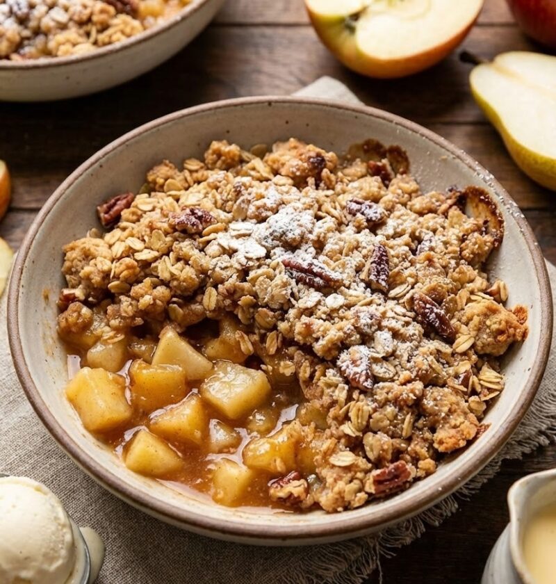 This comforting apple and pear crumble is a timeless British pudding inspired by the warm, unfussy style of . Soft, gently spiced fruit bubbles beneath a crisp, buttery topping that turns golden in the oven. It is an easy, dependable bake that suits beginners and experienced home bakers alike. From start to finish, it comes together in under an hour and fills the kitchen with the most inviting aroma.