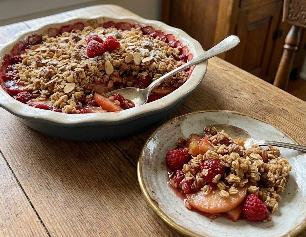 This comforting apple and raspberry crumble is a timeless British pudding inspired by the simple, dependable style of :contentReference[oaicite:1]{index=1}. Soft, gently spiced apples and sharp raspberries sit beneath a buttery, golden crumble that turns crisp on top while staying tender underneath. It is an easy, forgiving dessert that suits confident beginners and experienced bakers alike. From start to finish, it takes just under an hour and is perfect for relaxed family meals or Sunday lunches.