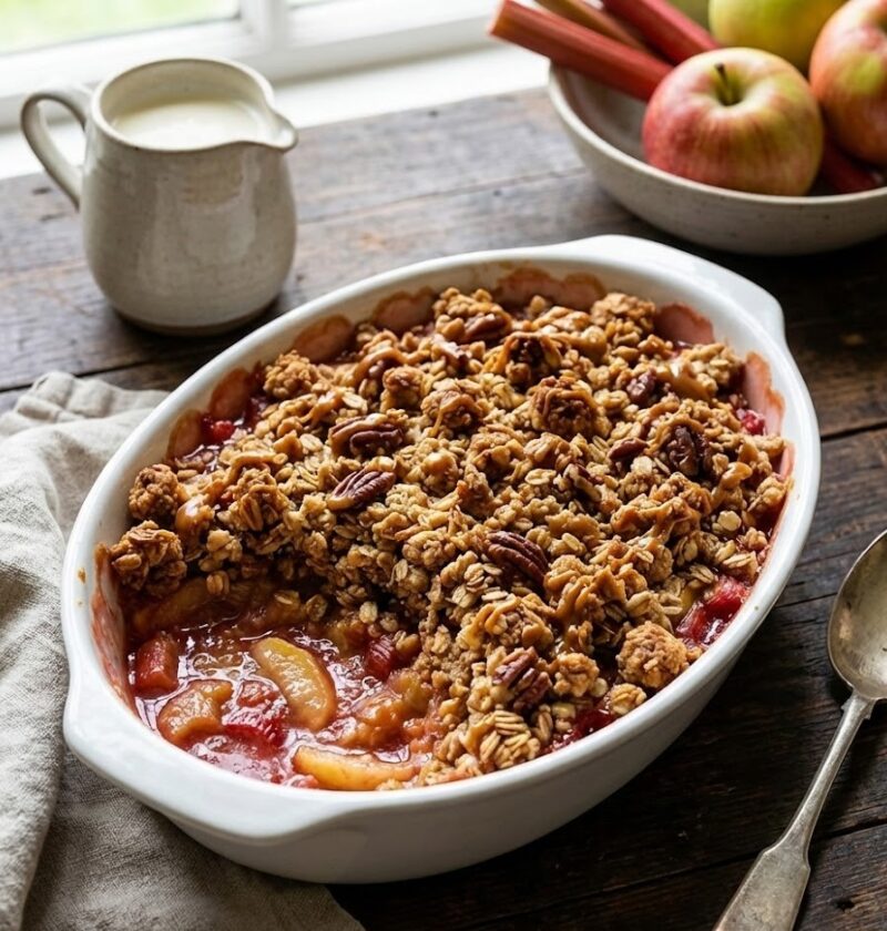 minutesA comforting British apple and rhubarb crumble with soft fruit and a crisp, buttery topping. Easy to make and perfect served warm with custard.