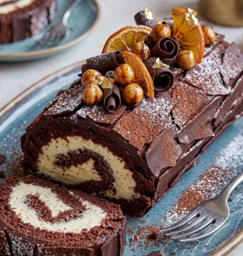 - Assembling the log: Carefully unroll the cooled sponge and spread the chocolate filling evenly over the surface. Roll the sponge back up tightly and place seam-side down on a serving plate.